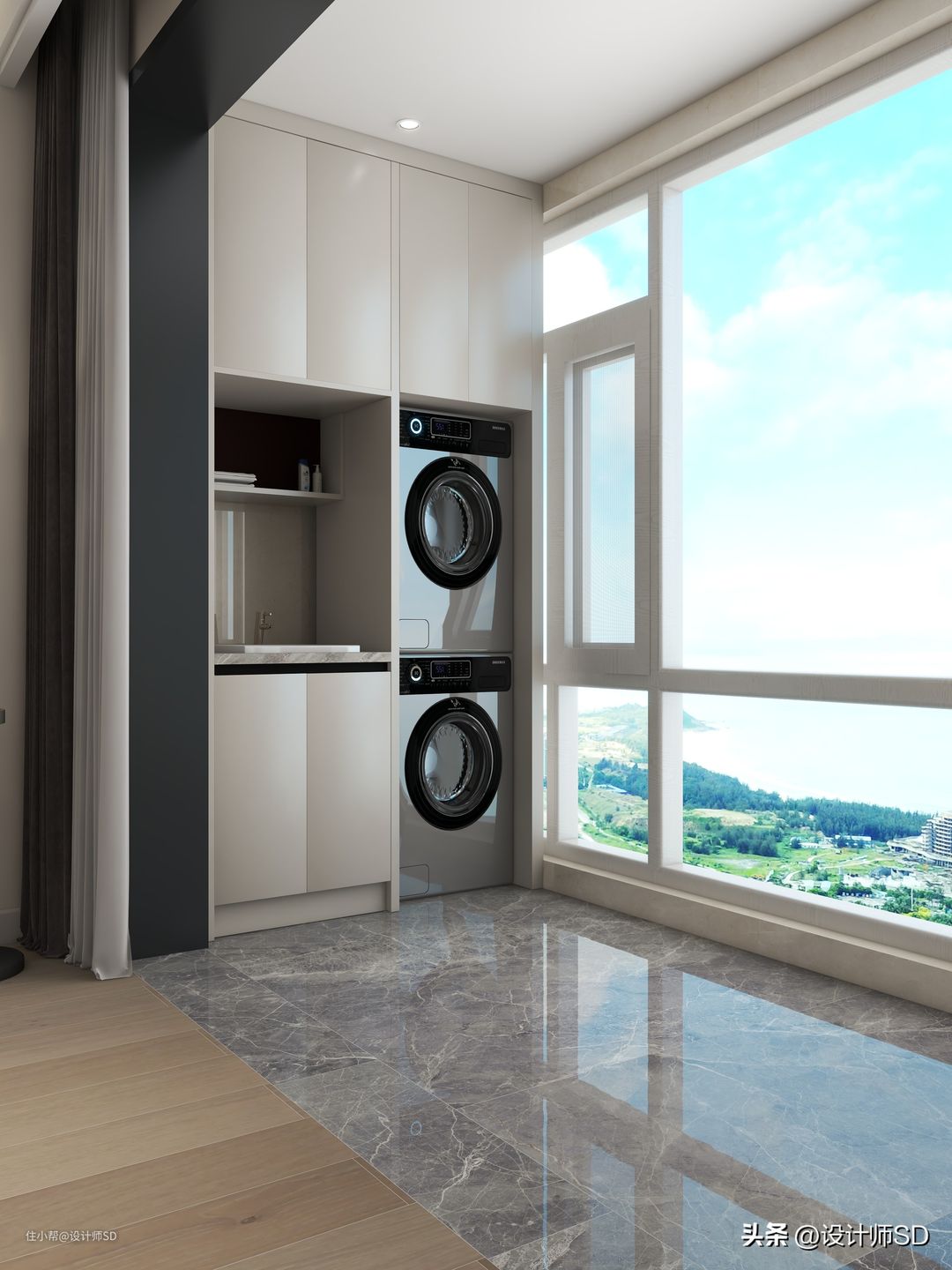 左侧做了洗衣柜,洗衣机跟烘干机作为上下摆放,左边还留有洗衣池的空间,上方则是储物收纳柜,整个阳台很是实用舒适。