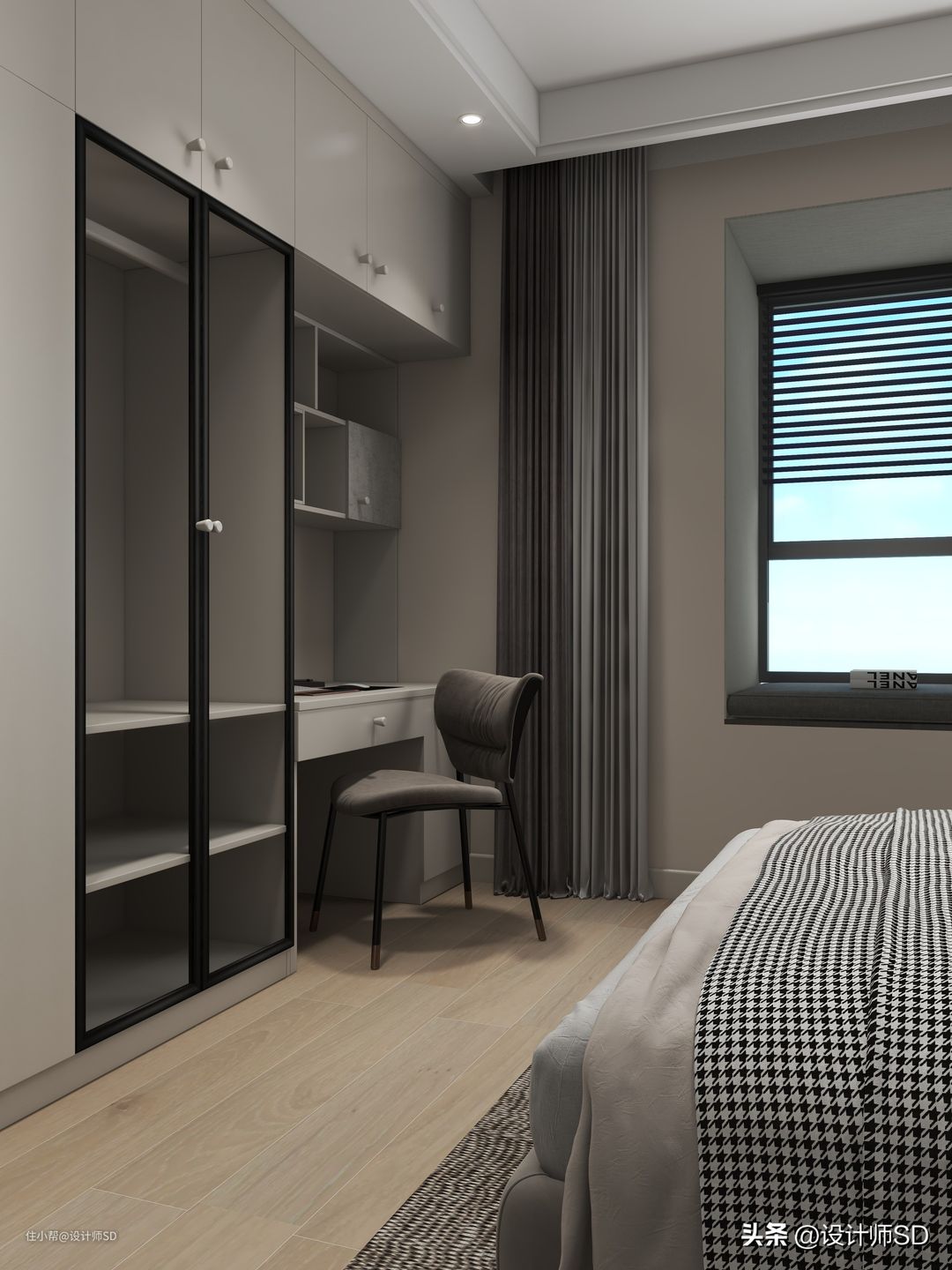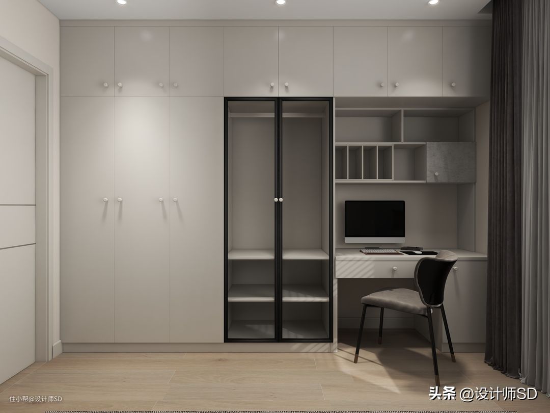 一排超大的衣柜很是实用,将衣柜布置在了床的对面,是衣柜面积更加增大。左侧做平板柜门,搭配了两扇黑色边框的玻璃柜门,看上去简约又通透,右边则做了一组书柜书桌,中间还做了开放格,可以放些摆件跟常看的书籍。整个柜体看上去很是实用。