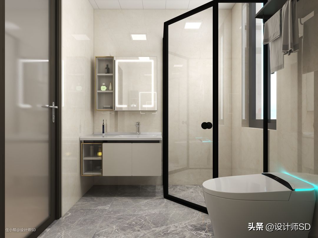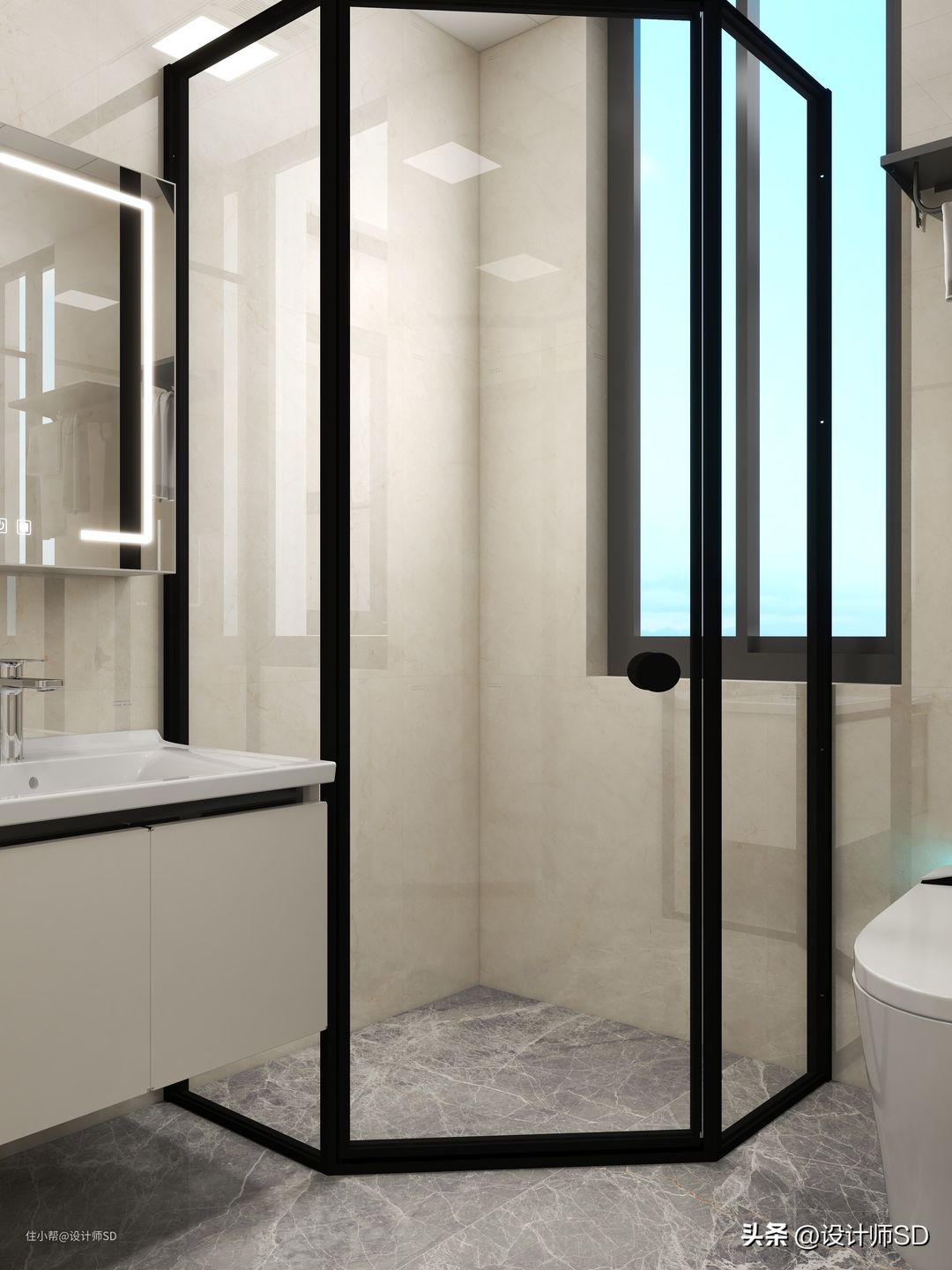 整个户型只有一个卫生间的空间,所以在改造的时候有把面积扩大,向次卧延伸了一些尺寸。卫生间基本呈正方形的空间,依次摆放洁具。地面铺贴灰色系的瓷砖,稳重又耐脏,墙面铺贴米黄色的瓷砖,看上去很是温馨。左边的浴室柜搭配镜柜的造型,使用又美观,再点缀一些金色边框的长虹玻璃柜门,整体很是大气。在转交的位置放置了独立的钻石型玻璃淋浴房,黑色的边框搭配透明的玻璃柜门,通透性更强,右侧则是摆放智能马桶,这样的布置让进门的空间大了很多。
