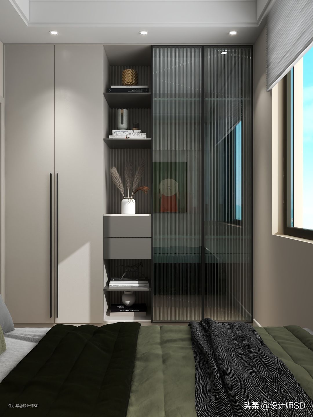 在次卧也布置了一组大衣柜,左边的两门是一门到顶的造型,看上去简洁,中间则是做了开放格的跳色再搭配抽屉,摆放书籍跟工艺品摆件,右边则是两门,黑色边框的长虹玻璃柜门,整个衣柜看上去很有档次。