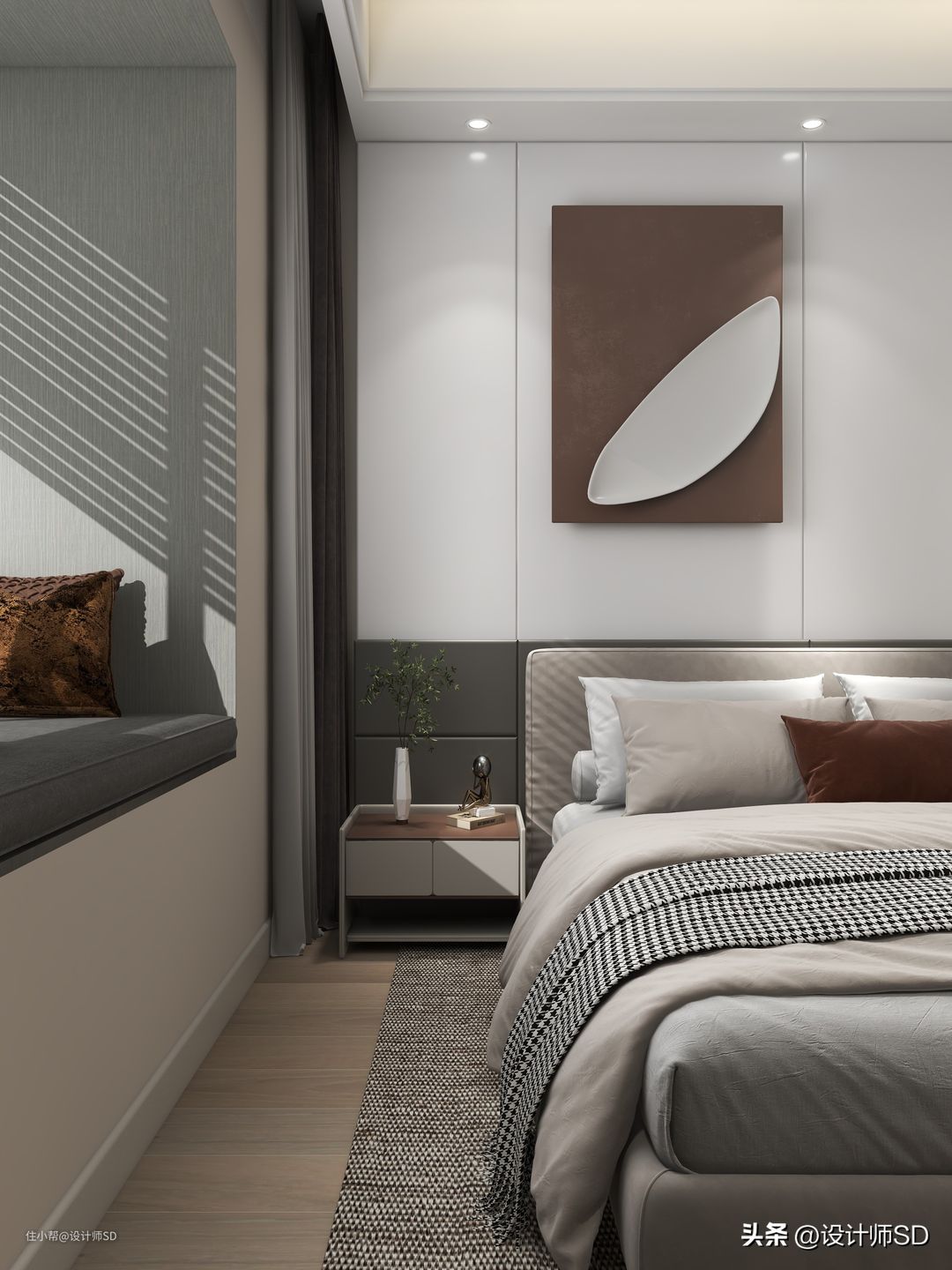 墙面满刷杏子灰的乳胶漆,床头墙面做了背景墙的点缀,分为上下的造型,下方用深色的硬包做墙裙,上方则是白色的饰面板做些黑色的抽缝,搭配一幅精致的装饰挂画,都让整个卧室尽显高级大气。