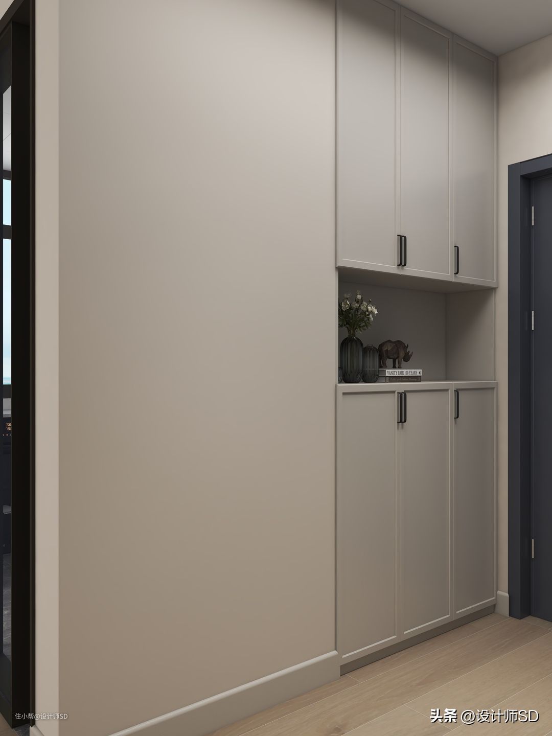 斜柜在入户门的右侧,三门的布置,下柜做储物收纳空间,中间做镂空,可以放置一下随手的物件,也可以放些精致的工艺品摆件,上柜也是收纳空间,素色的柜体板搭配同色的拼框柜门,整个门厅看上去很是舒适。