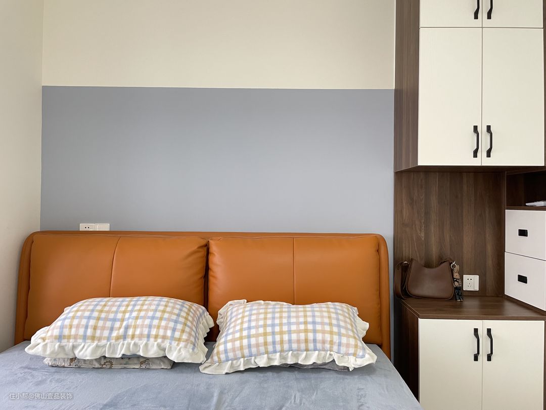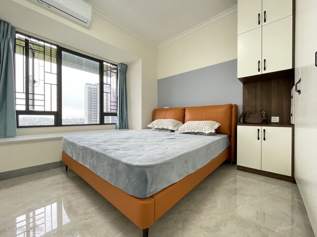 床等软装:床是采用了爱马仕橙的皮质床头背景,丰富了整个卧室的色调,同时也凸显时尚质感,搭配了香芋色的四件套,色调搭配相协调。飘台先用瓷砖进行铺设,再垫上地毯,内飘窗窗帘的搭配,延伸了整个空间的视觉效果,但不影响空间的整体采光和通风。