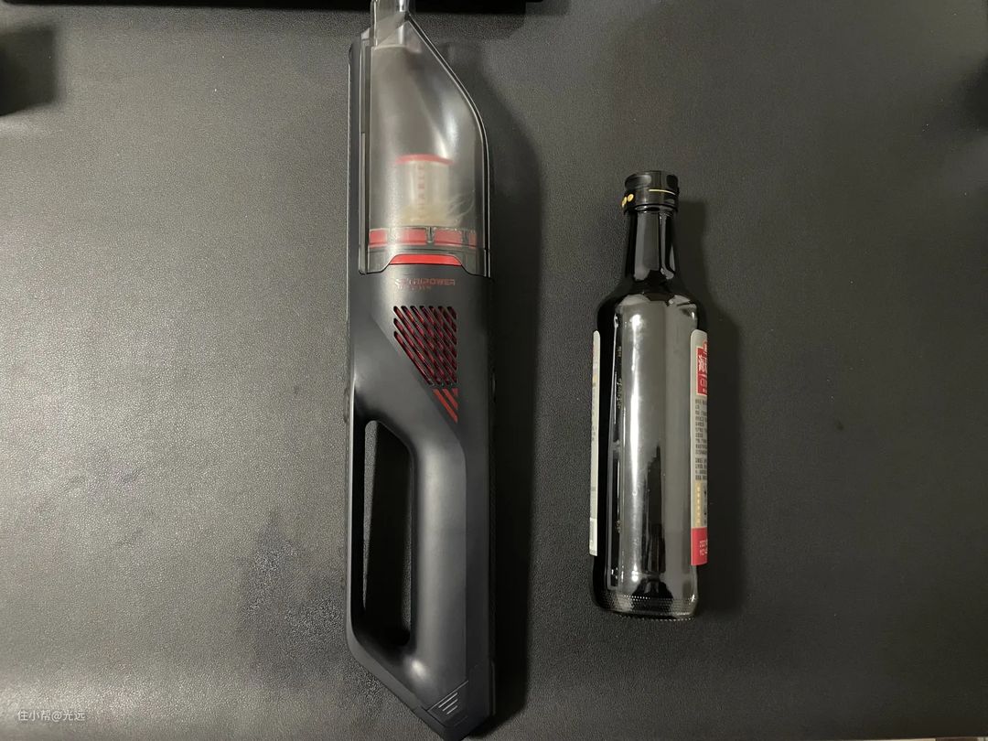 先看外观,我喜欢的高科技感,做工小巧精致,包装轻巧简洁,黑色很有质感。主机机身重量仅为808g,长度为41.5cm,与红酒瓶相当,手柄内的弧度设计的很合理,单手即可握持且不易脱落,对家庭主妇十分友好,可以抱着孩子的同时做家务。