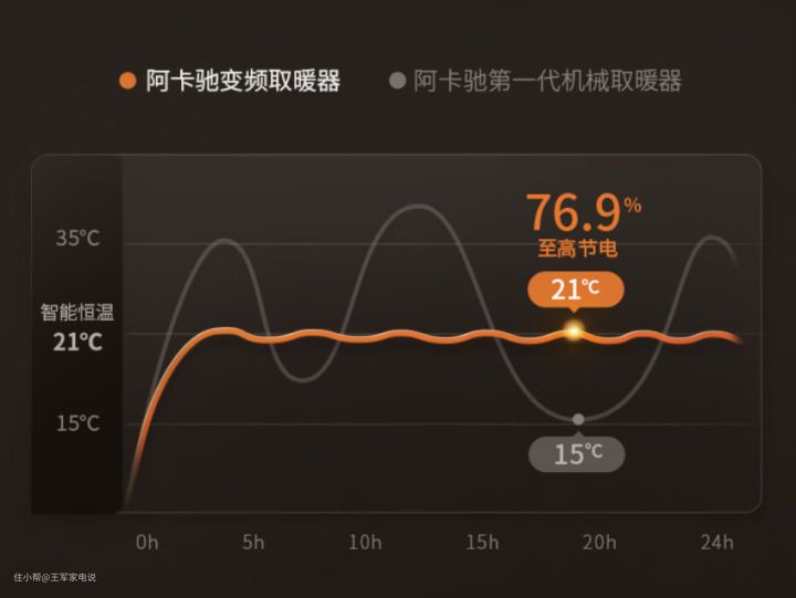 对比起第一代阿卡驰3000w机械款的取暖器,省电达到76.9%,平均每小时低至0.21元;