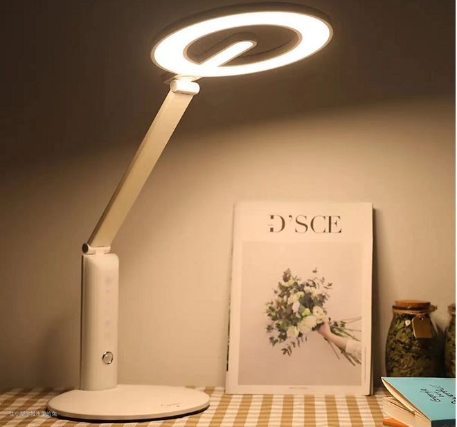 从外观上看,黑白的配色简约大方,整个灯具采用DL-SES银离子表层抗菌技术,能够有效避免细菌的滋生。金属的底座,稳固不摇晃,上有可视化面板,切换灯光操作简单。 四轴设计,灯头与灯臂皆可旋转,仅凭单手即可自由调节适合的角度。而且,无论灯臂如何调节,照明永远与桌面平行,保证光源不偏移,跟随孩子的用眼习惯。 光源采用缓启动的方式,柔和的递进速度,不刺激瞳孔,给眼睛最好的呵护。环形的光源更能减少手部阴影,不会遮挡书面,影响视物,造成视觉疲劳。 它的有效光照面积很广,光圈范围直径长达1.2米,足以满足孩子的学习区域。几乎能覆盖整个桌面,解放局限,还能进行亲子阅读,增进亲子之间的关系。
