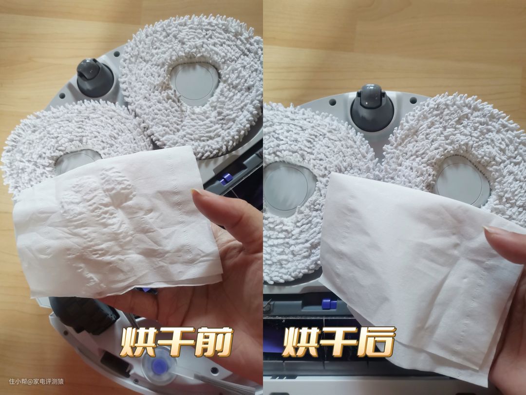 来看看拖布烘干前后的效果对比,肉眼可见烘干得非常彻底: