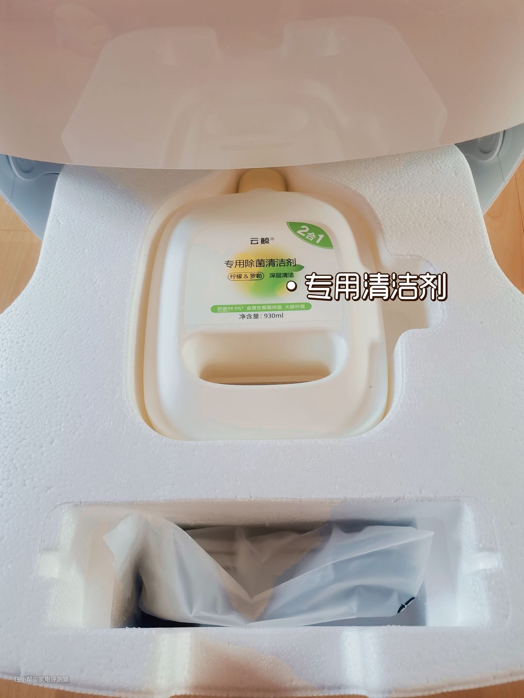 除了基站和主机外,箱子里还随机附赠了一大瓶专用清洁剂: