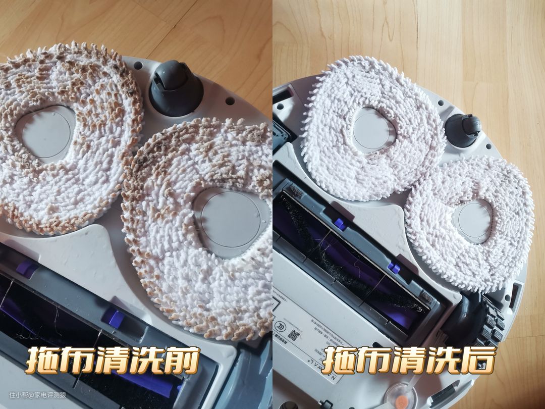 我记录了在鲸灵托管模式下回洗拖布前后的拖布变化,可以看到拖布的清洁效果非常明显: