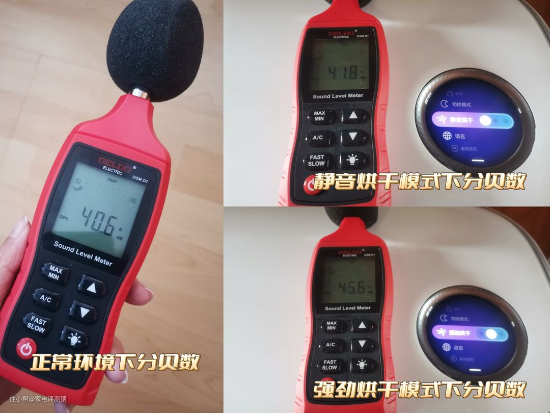 同时我也记录了烘干前与不同烘干模式下烘干时的分贝数据: