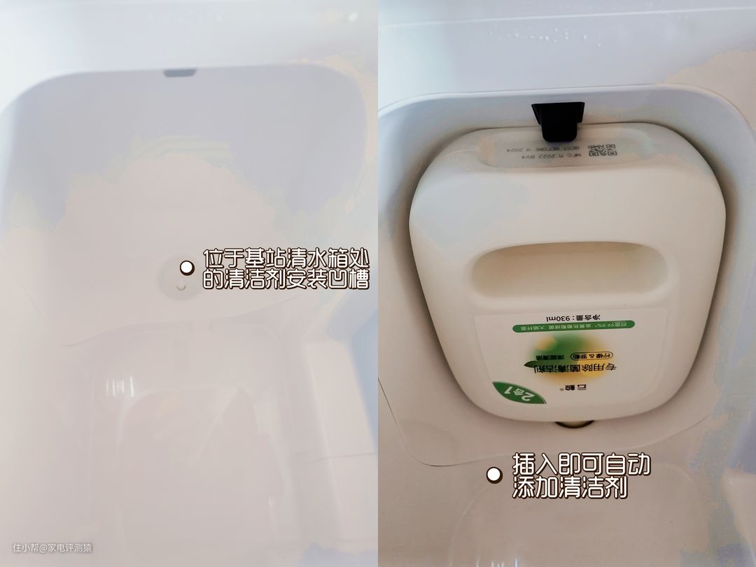 取出基站内的清水箱就能看见安装清洁剂的凹槽。将清洁剂倒置插入凹槽,即可完成安装!云鲸三代-J3小鲸灵会自动进行清洁剂的添加~
