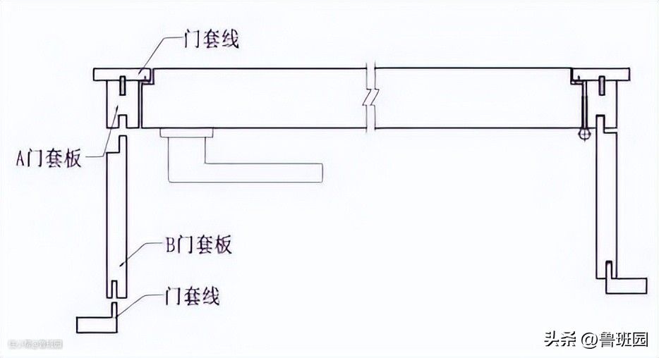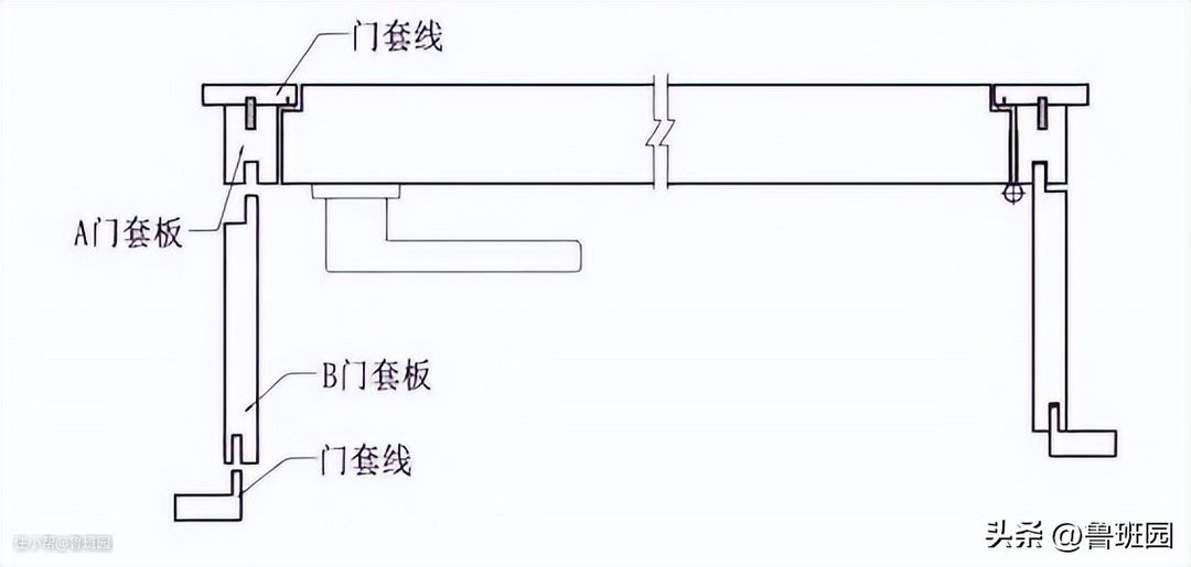 因A套板上需安装合页,所以背面带加厚条增加其强度。如果门套板内侧为门套线,可将B套板开槽,通过门套线插片进行连接。门套线插片插入的深度可适应不同墙体的宽度(下图)。
