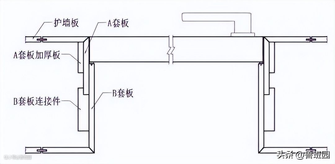 暗门分为外开暗门和内开暗门,外开暗门通常将护墙板与门做平,可在门的一侧铣拉手槽,亦可安装门把手。如下图所示A套板和B套板在工厂分别单独加工,安装现场A套板和B套板通过插榫方式进行连接,打胶增加强度。