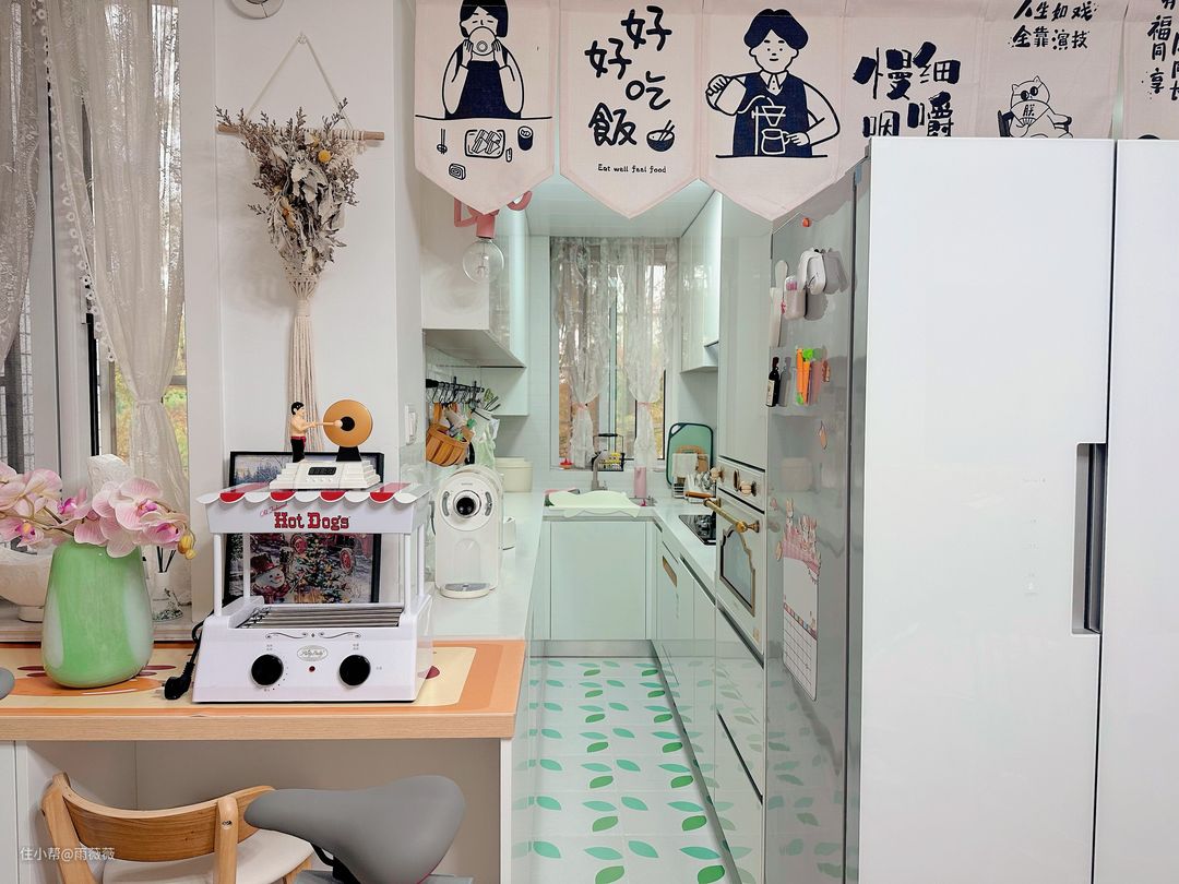 砸掉一堵墙,做了半开放式厨房,过道虽然只有60cm,却是我装修最满意的一个决定。4.5平米的厨房打通,和吧台客厅相连,这样的半开放式厨房是我理想中的样子。