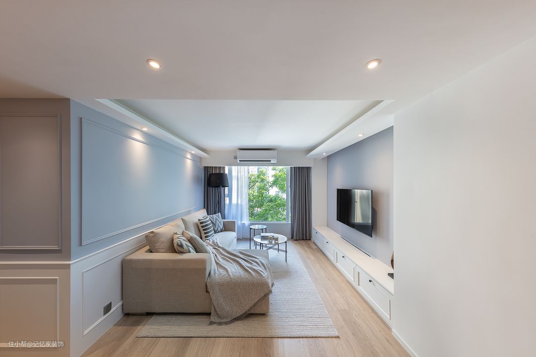 蓝色尤其是浅蓝也是沙发的常用色,蓝色沙发搭配绚丽色彩的抱枕,让客厅色彩感更丰富还不混乱,一般搭配灰色的背景墙,让整个空间显得静谧,营造独立的世界,这样的空间让人沉浸间。