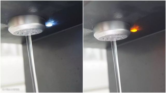出水氛围灯,这个设计也挺不错,50℃以下是白色灯光,如果是50℃以上,灯光变成橘黄色,不仅能照亮水杯,查看接水情况,还能提示,有高温预警作用。