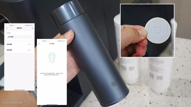 再来看看一个行业首创的专属身份识别,附送的水杯是已经内置了NFC感应芯片,通过APP上设定对应水温和水量后,只要将水杯放到净饮机接水位置,就会自动出水。而且其他被子也是可以这么设定的,只要在底部贴上这个NFC标签,普通水杯立马变智能,真正做到快捷全自动接水。