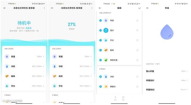 这款净水机并不能通过APP来实现远程控制,不过作为这类近场使用的产品,也没有远程使用的需求。不过通过米家APP可以查看目前操作的状态,比如是待机中,还是其中某个模式,或者反映冲洗的进度。而在机身上操作的模式都是可以自定义设置的,目前在机身操作界面最多可显示八种模式,每一种模式可以设定水温、默认杯量、杯量档1和杯量档2。