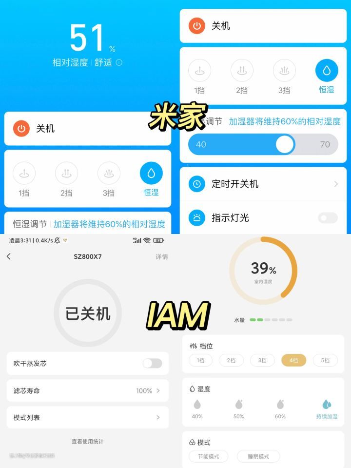 不过米家和IAM的加湿器都是支持与APP联动控制,这点可以算是懒人福音。