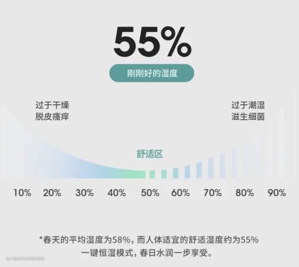 而智能恒湿功能,就是通过湿度传导系统监测当前的环境湿度。如果空气湿度过低,则增大加湿量,空气湿度趋于55%时,则降低加湿量或停止,让空气湿度一直保持在一个让人体感觉最舒适的区间。
