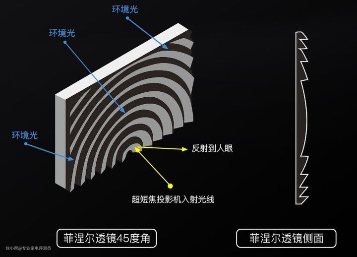 菲涅尔屏的原理和黑栅抗光幕很相似,都是一面反射光线,一面吸收光线的原理,但是菲涅尔屏的结构是从大到小的同心圆纹路,因此只反射投影机位置投射出来的光线。