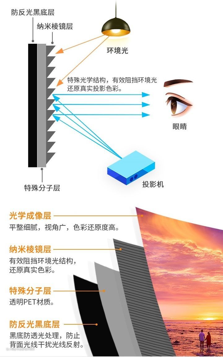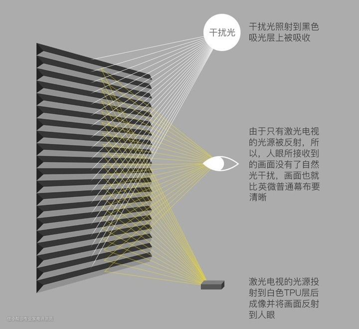 黑栅抗光幕表面横向布满了非常细小的棱镜结构,从侧面看放大看和锯齿的形状一样,锯齿的上方是黑色,下方是白色,上方的黑色吸光层可以吸收来自屏幕上方的环境光线,下方的透光层则可以反射来自于超短焦投影机投射的光线,以此达到抗光的目的。因此在白天看也会很清晰。