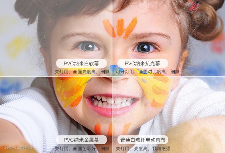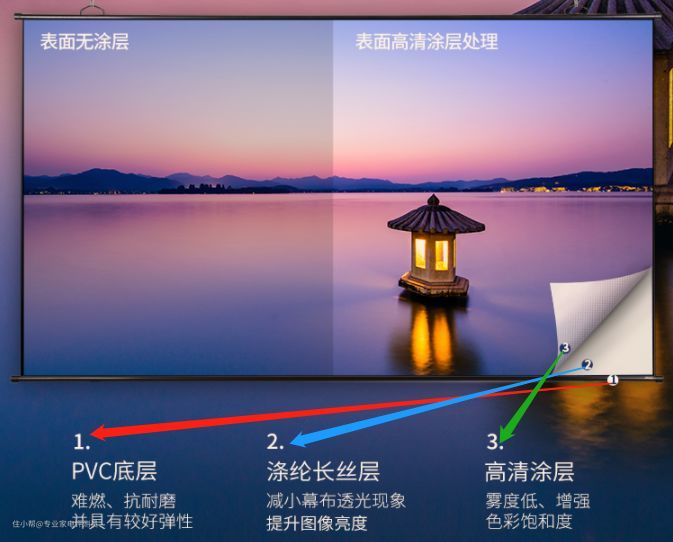 入门级幕布,有三种材质可选,分别是白塑、白玻纤和金属。建议选择玻纤材质,色彩还原效果会好一点。