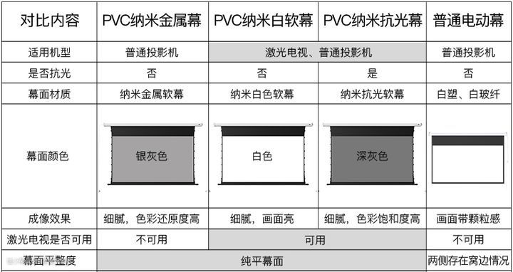 这款幕布有三种材质可以选择,适用于不同焦段的投影仪。