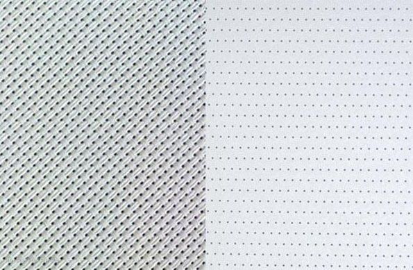【左侧为编织透声幕,右侧为打孔透声幕】