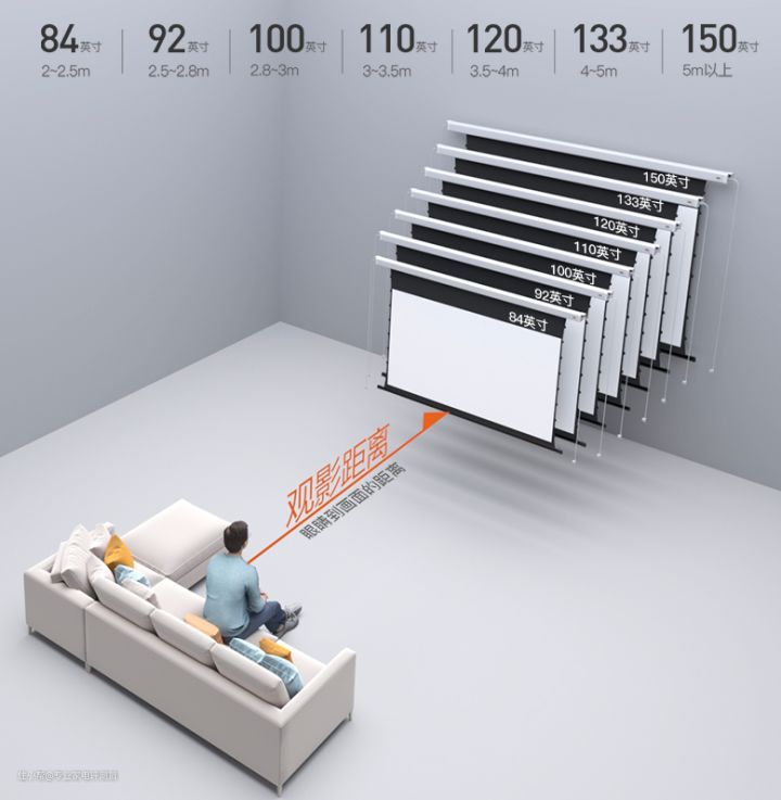 通常情况下,投影幕布尺寸=投影仪投射的画面尺寸。可以参考下图确定你的观影距离及画面尺寸。