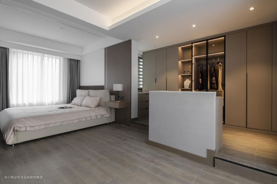 卧室大气色彩淡雅,完美贴合业主的气质,温润的木色延续于此,运用衣帽间抬高处理,将两个场域进行了分区,完成彼此交互和视线延伸,又保证了各自空间功能的完整性。