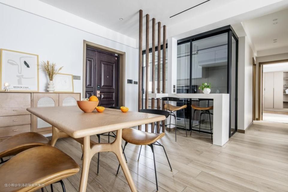 和常规的狭窄型入户不一样,这个户型打开门可以看通客餐厅。为了改变这种直视的裸露感,在入户区域做了实木格栅,若隐若现,亦不死板沉闷。