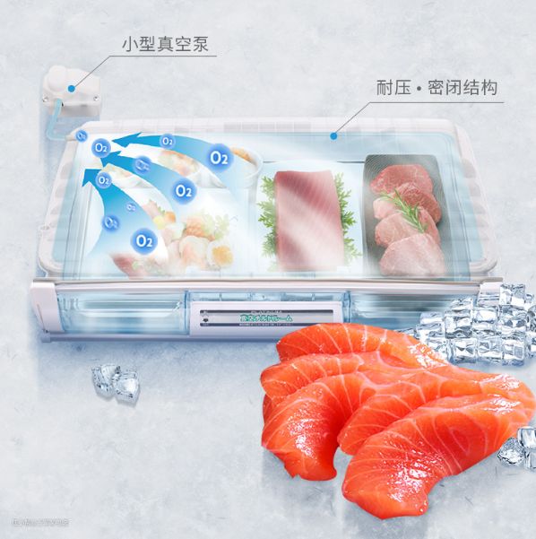 这个技术和东芝的星级料理舱原理很像。变温室内的温度为-3度,在这个温度下,食物内部也是微微结晶,表面覆盖一层薄薄的冰,可以阻隔氧气和食物接触,防止氧化和微生物降解引起的变质和异味。
