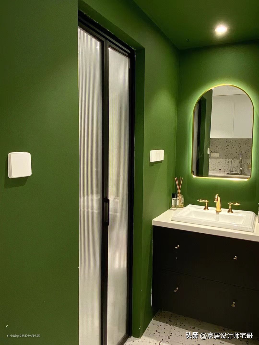 洗漱区在外面,拱形的镜子后方有暖色调的氛围灯,映衬着黄绿色的墙壁,真的很有一种法式复古的高级感。