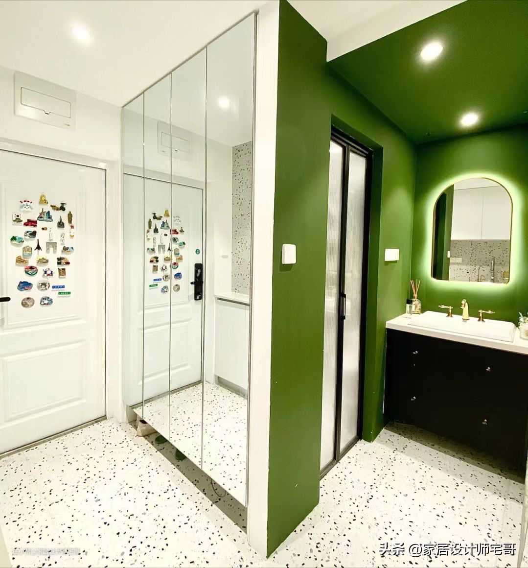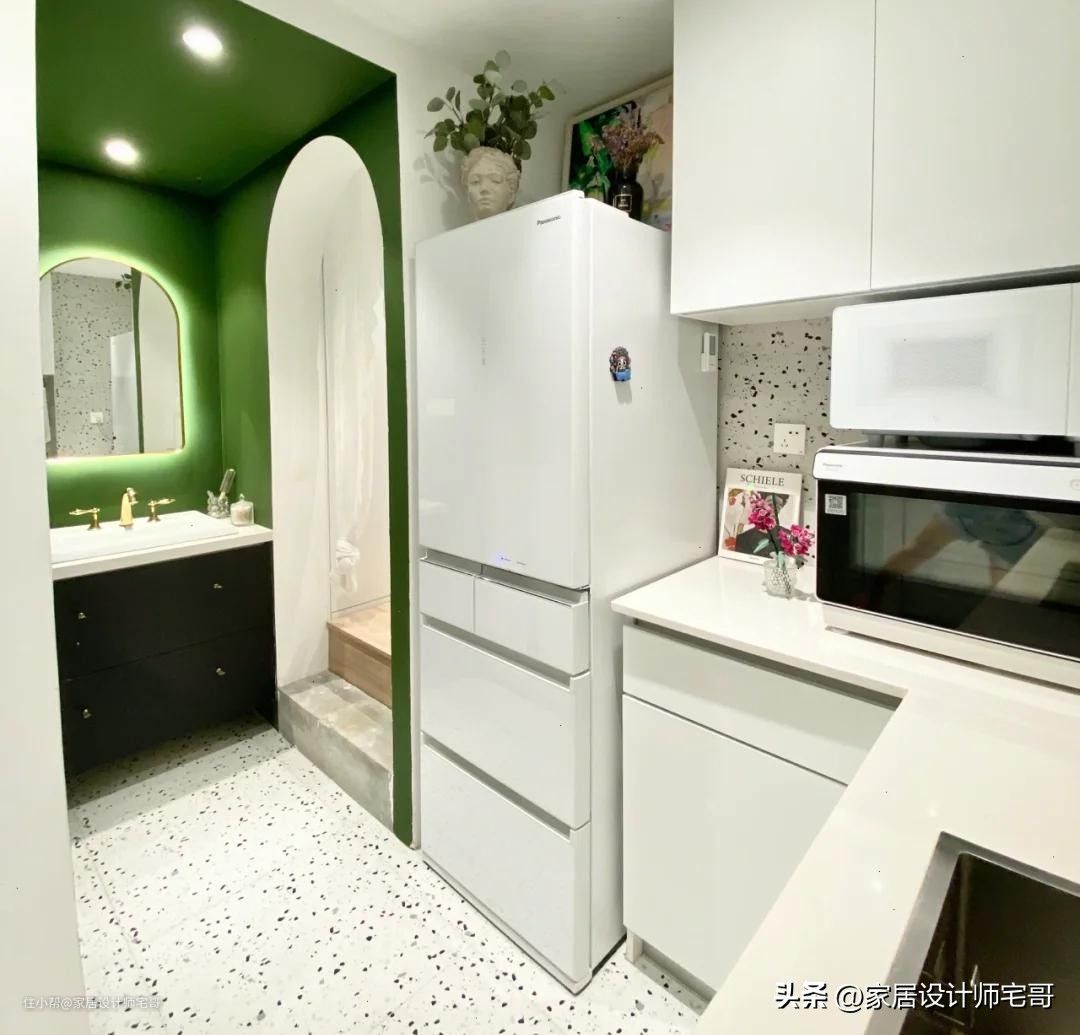 另一边的墙壁刷成了带暖色调的绿色,和白色搭配得也非常高级和协调,清新大气又时尚感十足。