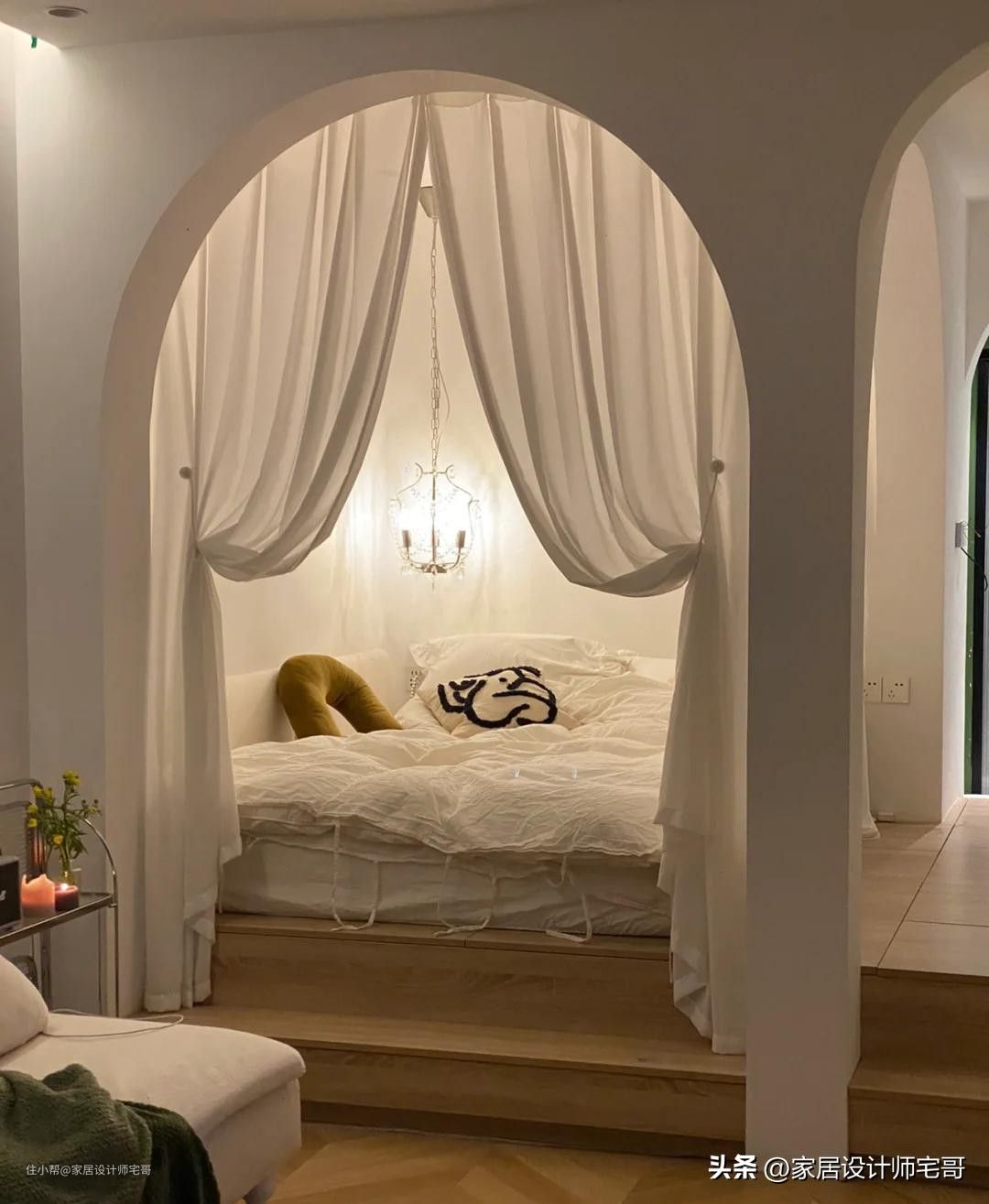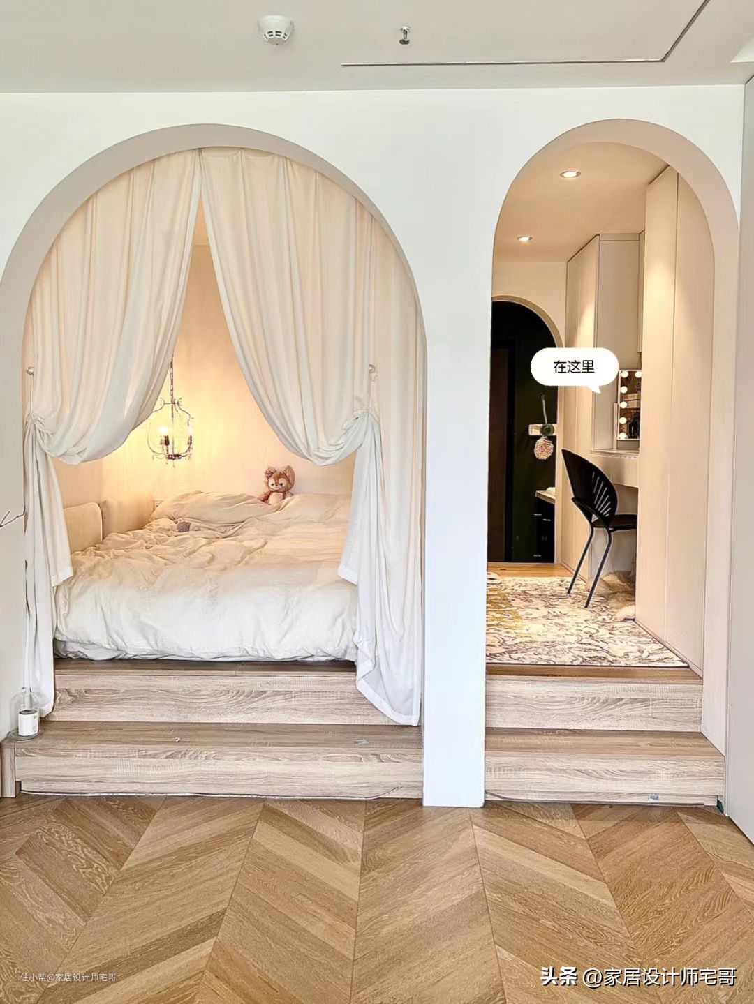 卧室两侧的拱门上安装了白色的纱帘,营造出仙气飘飘的氛围感,真的很漂亮。