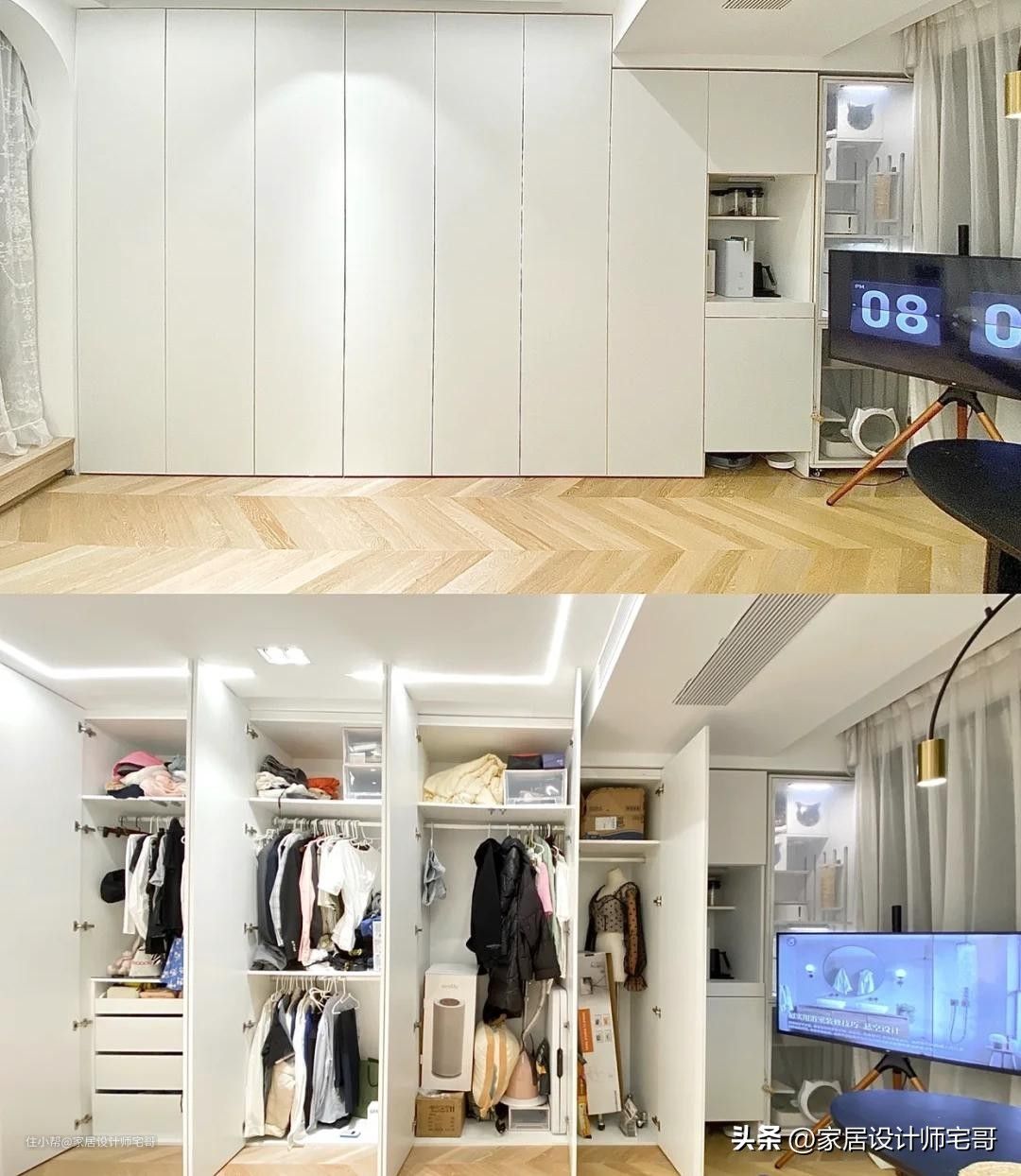 女生的衣服实在是太多了,需要更多的收纳空间,所以客厅的另一边,小姐姐放弃了电视背景墙,打造了整面墙的通顶衣柜。