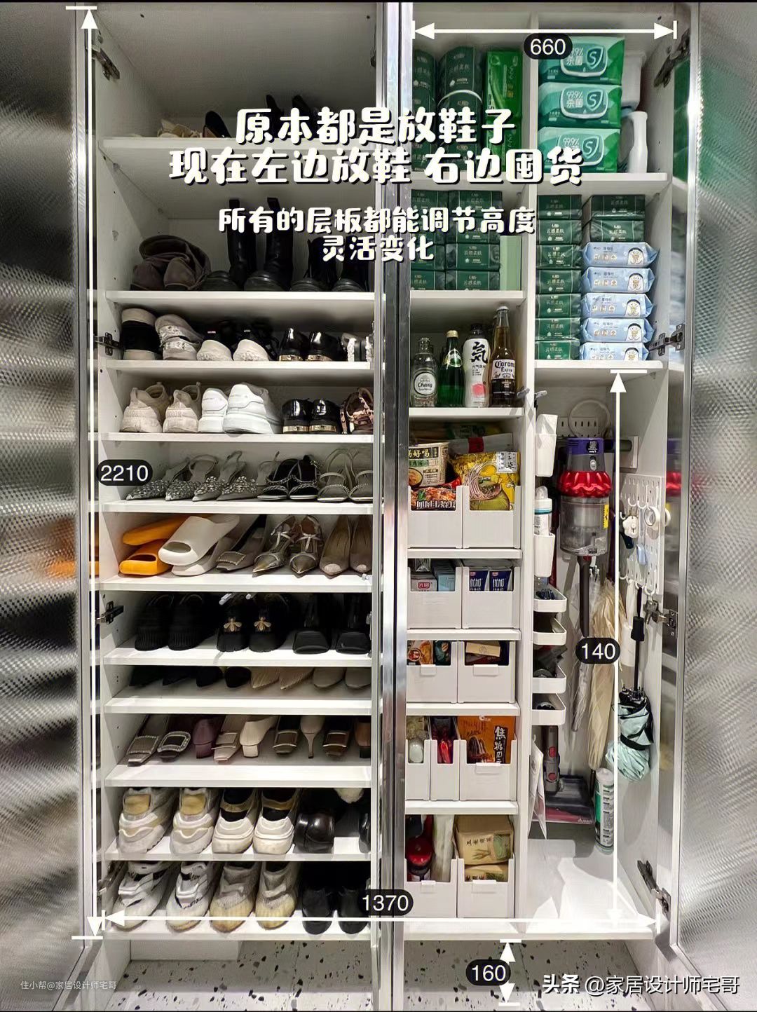 右边则是囤货区,平常买的纸巾、零食,还有雨伞、清洁用品等等都放置在这里,而且所有的层板都能调节高度,灵活变换,这样不管是什么样的物品,都可以很好地进行收纳了。