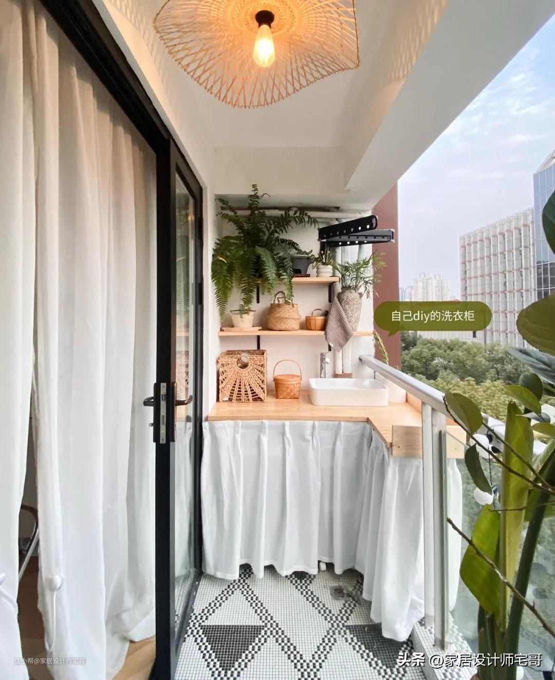 阳台的左侧,是小姐姐自己diy的一个洗衣机柜,下面安装了洗衣机,并用白色的帘子进行遮挡,美观又实用。