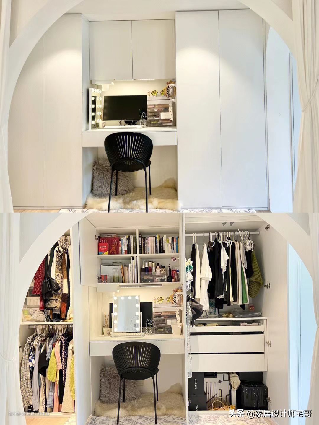 卧室旁边的走廊空间也没有浪费,打造成了一个集化妆区、工作区、衣帽间、储物间为一体的多功能空间。