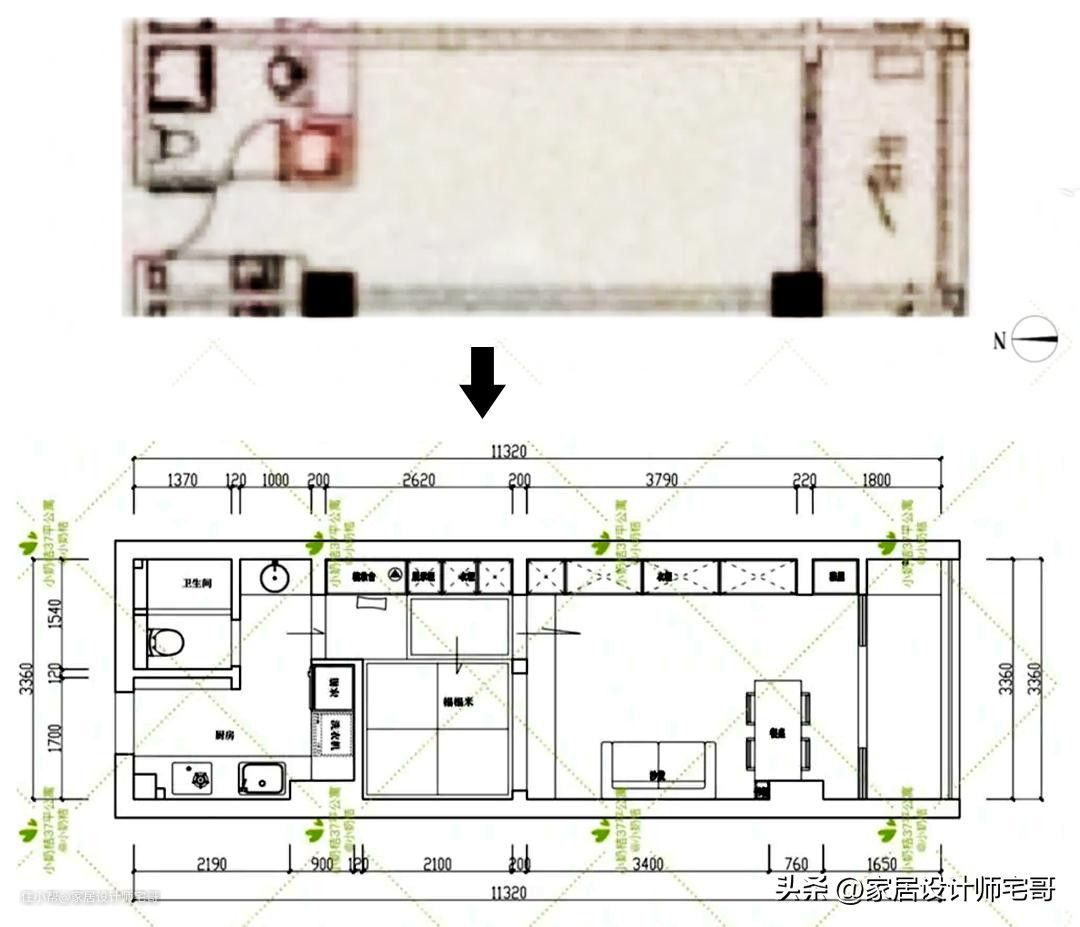 进门左侧的卫生间和右侧的开放式小厨房进行了保留,中间做了榻榻米的卧室设计,靠近阳台一侧则是打造了客厅和餐厅一体化的设计,既打造出了1室1厅,又保障了家里的私密性,真的是非常巧妙的设计。