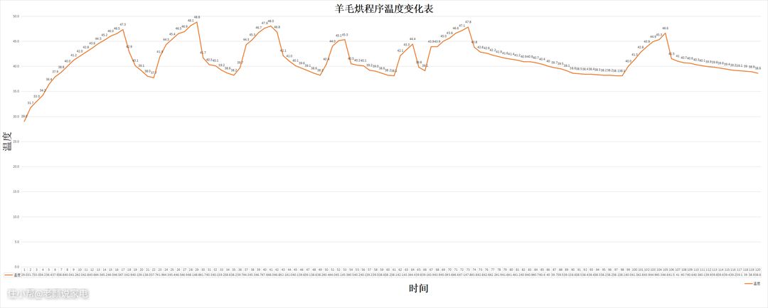 为了测试羊毛烘程序是否能精控温度至40℃,老颜做了一个小测试,利用热电偶温度计对内筒进行测温,并记录每分钟的内筒温度,测试结果如下图: