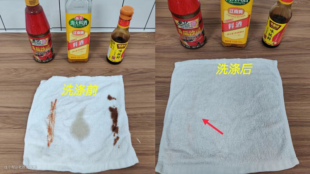 测试对象:沾上番茄酱、料酒、酱油的白T恤和毛巾。(为了测试更加贴近现实,将沾上污渍的毛巾跟白T恤放置五小时后再进行洗涤测试)