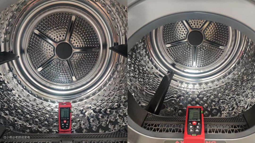 通过测距仪可以发现D1G烘干机的高度跟深度达到了和575mm和449mm,通过圆柱体体积公式Πr²*h可以粗略算出这款烘干机的容积接近至124L,这个尺寸的内筒相较于其他烘干机的内筒已经是比较大的,衣物在烘干时可以有更多的舒展空间,使烘干衣物不容易出现褶皱。