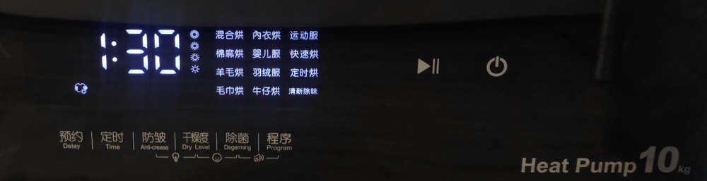 D1G烘干机的控制面板同样为全触控操作,从下图中我们也可以看到D1G烘干机所支持烘干程序有混合烘、棉麻烘、羊毛烘、毛巾烘、内衣烘、婴儿服、羽绒服、牛仔烘、运动服、快速烘、定时烘和清新除味这12种烘干程序,还可以看到各种功能的选择。