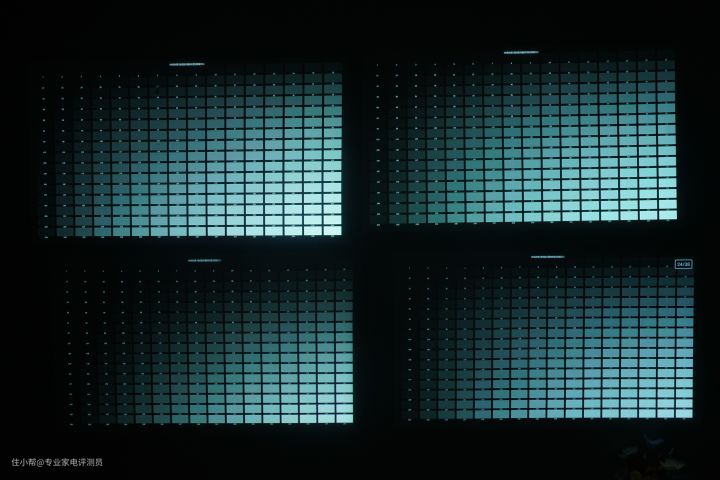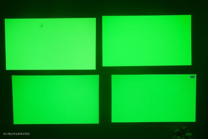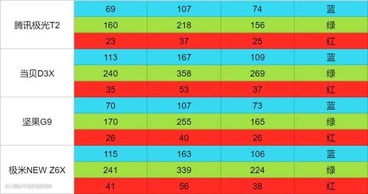 而对于三基色的亮度,我也进行了相关测试,大家可以参考一下。测试选取的位置是左上、右上两个亮度最低点和中下这个亮度最高点,从三基色的亮度中也能一定程度上了解各投影仪的偏色情况。