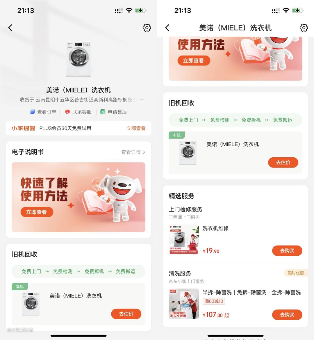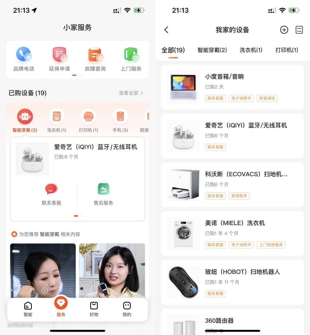 除了可以直观的看到机器的购买时间、质保期限等,还提供了相应的售后服务选择,满足家电全生命周期的用、养、修、换需求,非常方便。