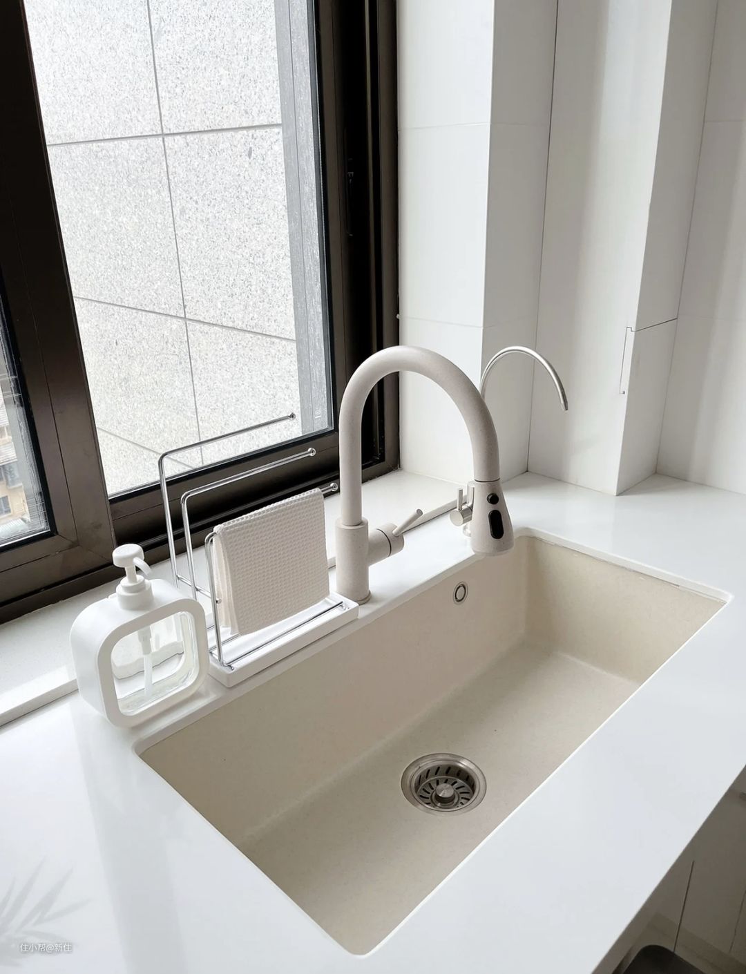 而真正当你跟风,将水槽换成奶白奶白的石英石后,除了刚装上让人欣喜,后面越用就会越头大。