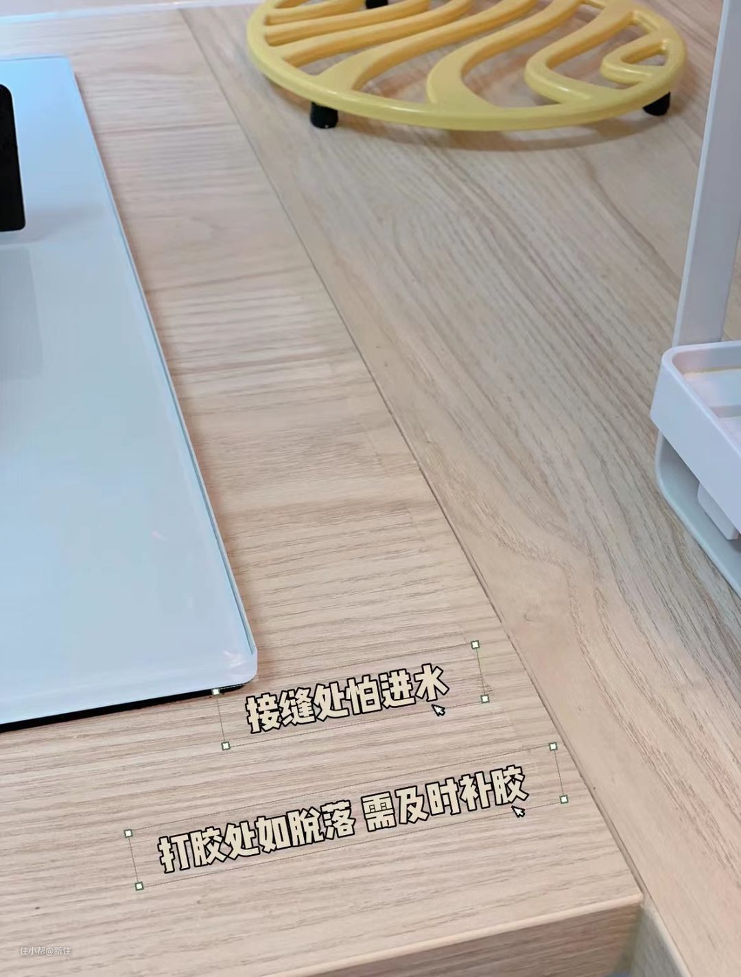 比如,台面上可以进最大可能保持即用即擦,那么接缝处呢?稍不留神,水渍便会从接缝处渗进木材里面,木材吸水膨胀、变形,出现接缝不齐平的问题。