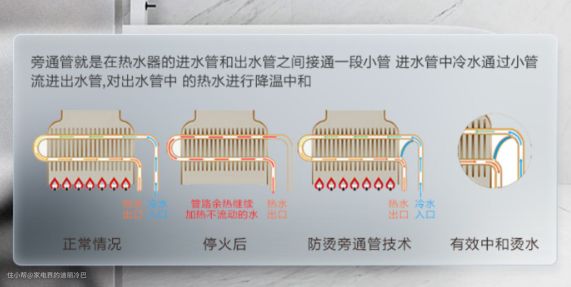 林内的进口芯片里面有旁通比程序,温度传感器会检测当前被加热的水温,然根据水温把过热的水通过混水旁通管与冷管二次供水进行适当比例混合,使水温波动降至1度。这时候用户再开水基本感觉不到水温的波动,也就没有烫伤的可能。